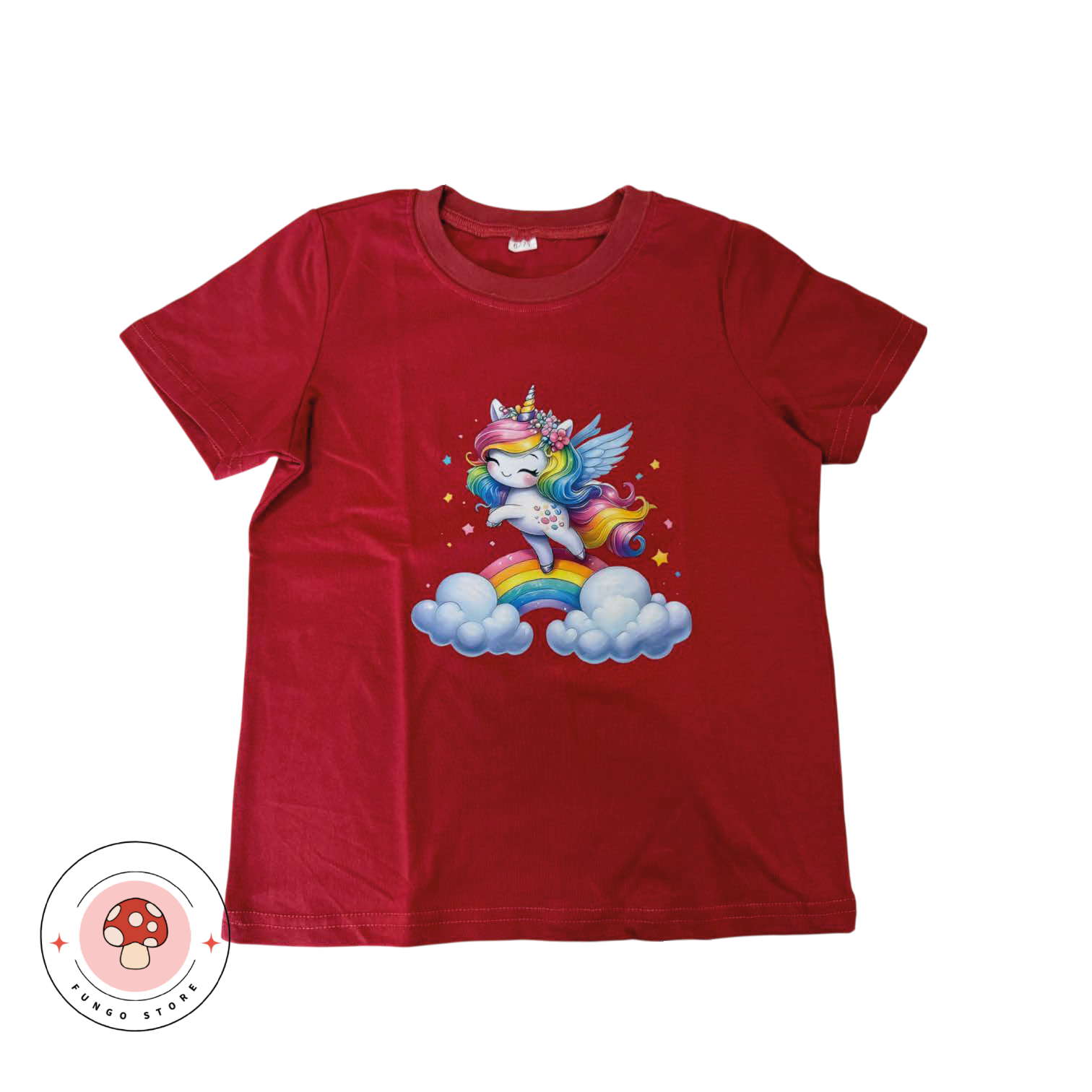 Un’esplosione di fantasia e dolcezza! Questa t-shirt rossa con stampa di unicorno alato che cavalca un arcobaleno conquisterà il cuore di ogni piccola sognatrice. Morbida, comoda e super colorata, è perfetta per tutte le avventure quotidiane.