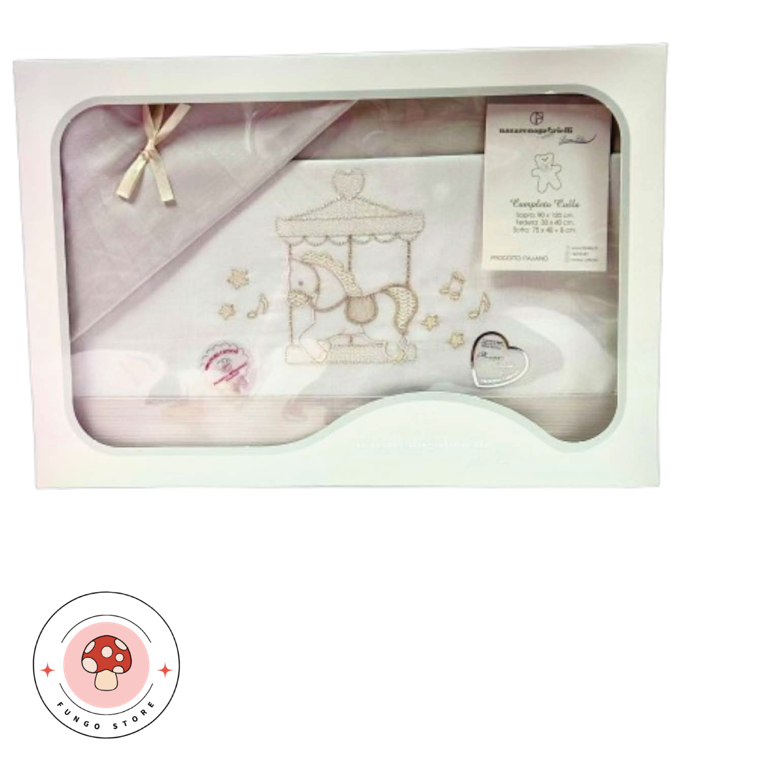 Completo lenzuola culla con romantico ricamo di cavallino a dondolo e stelline musicali