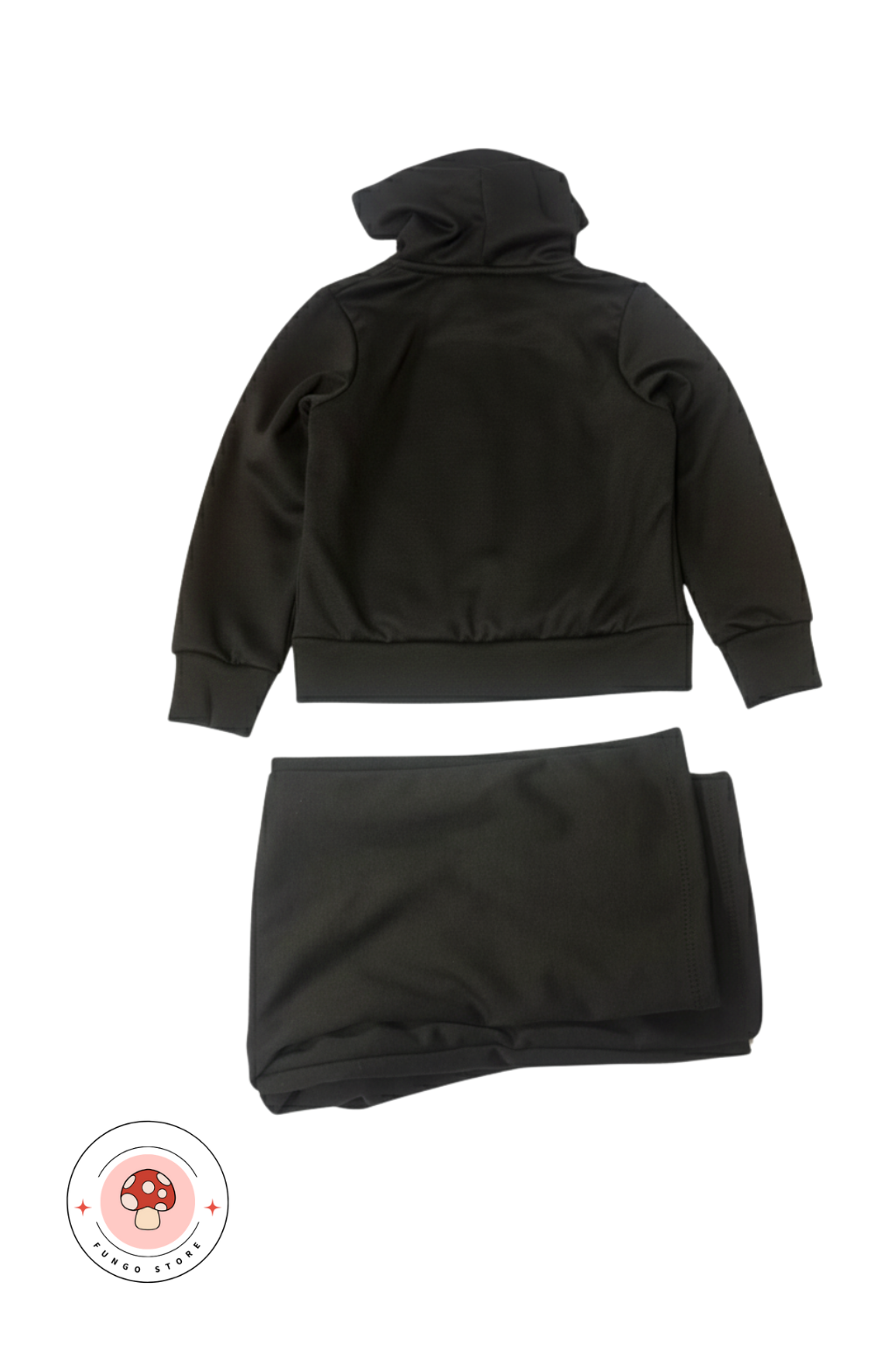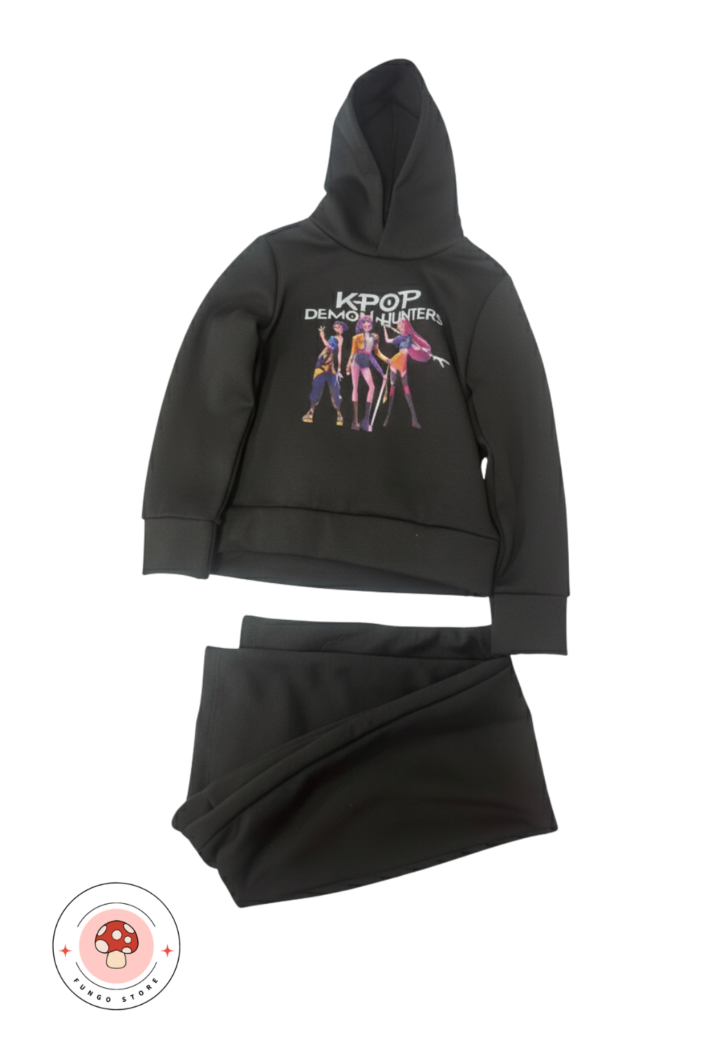 La felpa con cappuccio presenta una stampa vivace ispirata al mondo K-POP Demon Hunters, perfetta per dare carattere a ogni outfit. I pantaloni coordinati, morbidi ed elasticizzati, garantiscono comfort totale sia durante il gioco che nei momenti di relax.