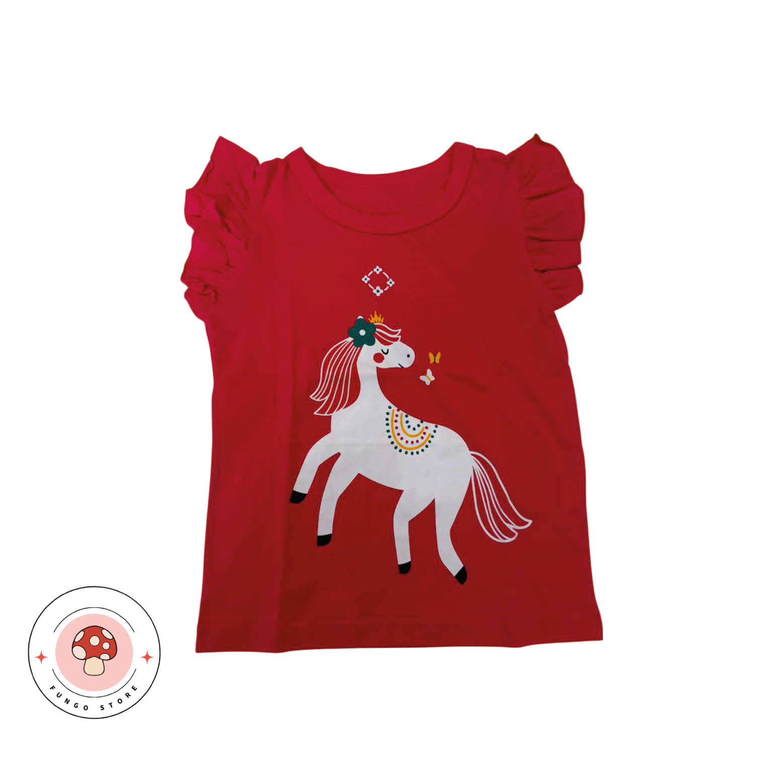 Un look allegro e regale per ogni piccola principessa! Questa t-shirt rossa con maniche a volant e stampa di cavallino bianco decorato è perfetta per aggiungere un tocco giocoso e chic alle giornate estive.