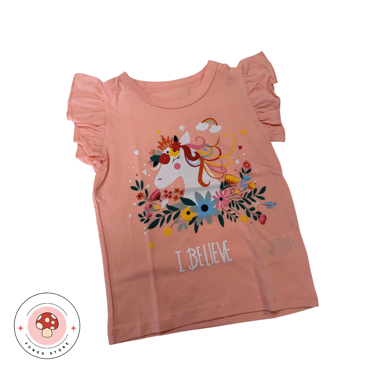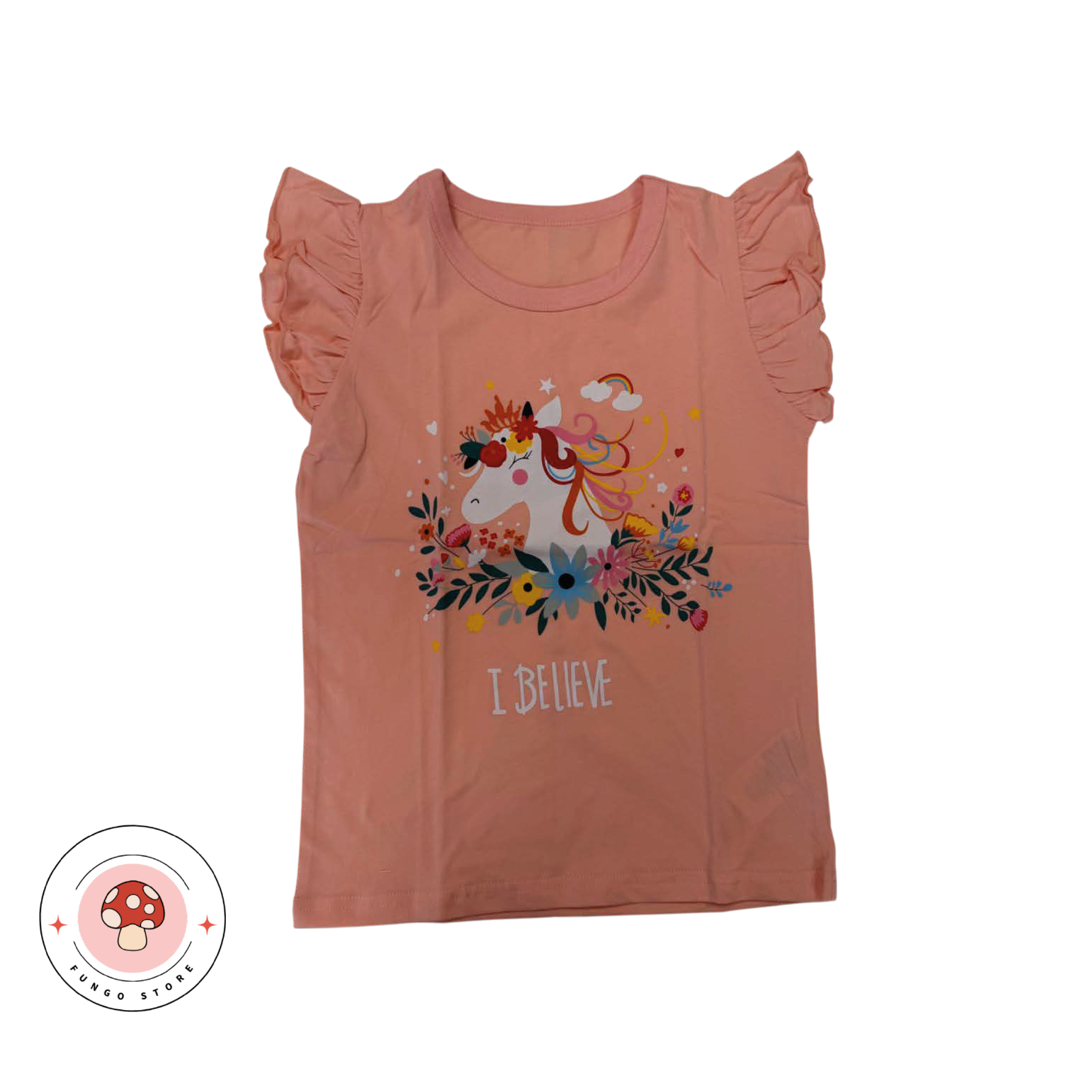 Una maglietta che profuma di primavera e fantasia! Con il suo adorabile unicorno tra i fiori, la scritta I BELIEVE e le maniche a volant, questa t-shirt pesca è perfetta per le piccole che amano sognare in grande.
