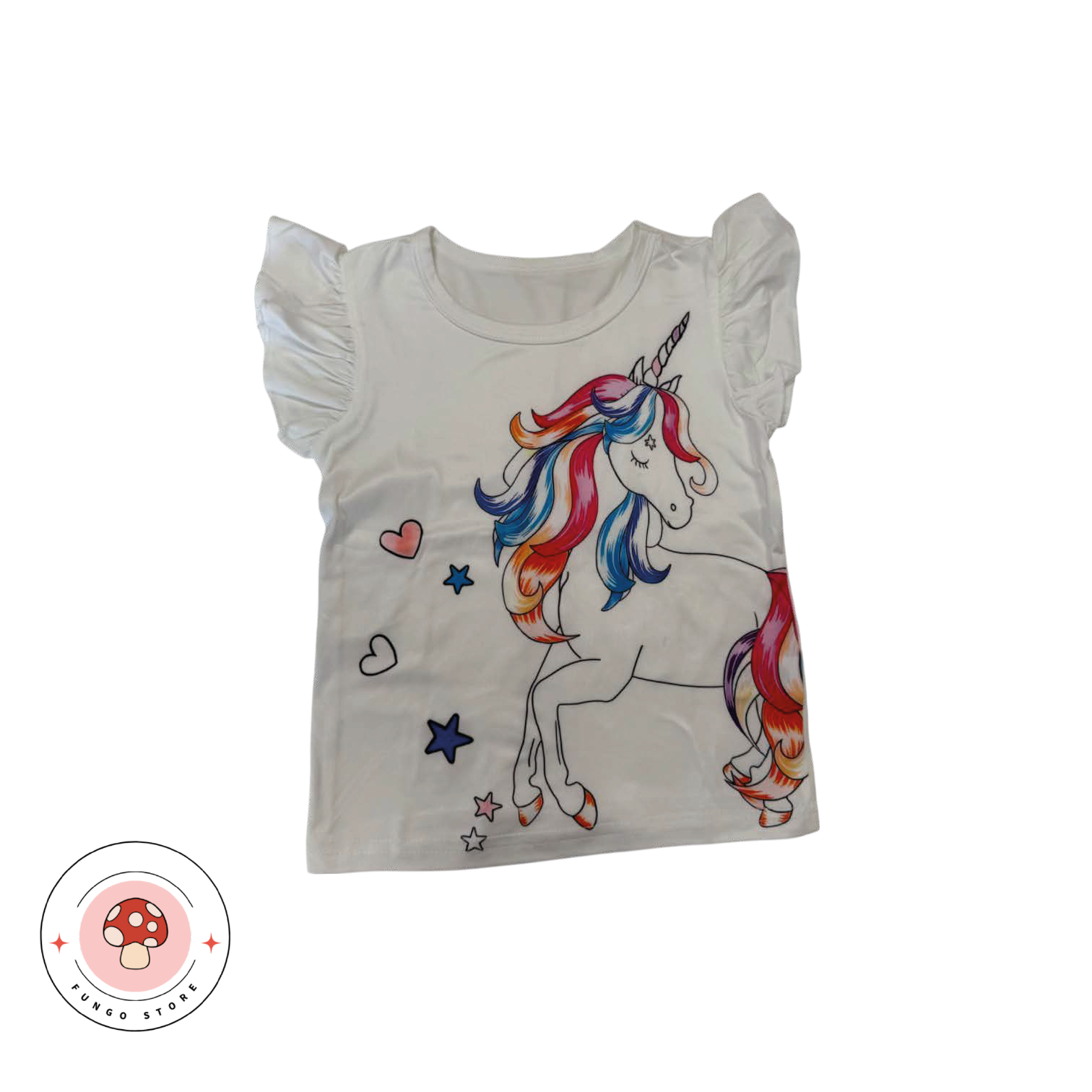 Una maglietta che fa sognare a occhi aperti! Con il suo grande unicorno arcobaleno, cuoricini e stelline, questa t-shirt bianca con maniche a volant è perfetta per tutte le piccole amanti della fantasia.