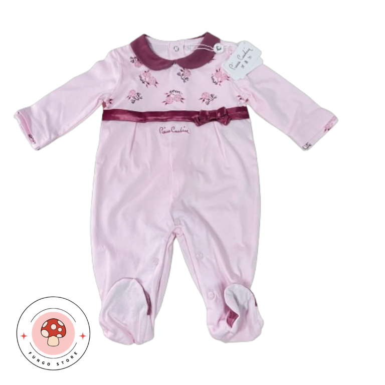 Tutina rosa chiaro con colletto borgogna, decorazioni floreali ricamate e fiocchetto in vita