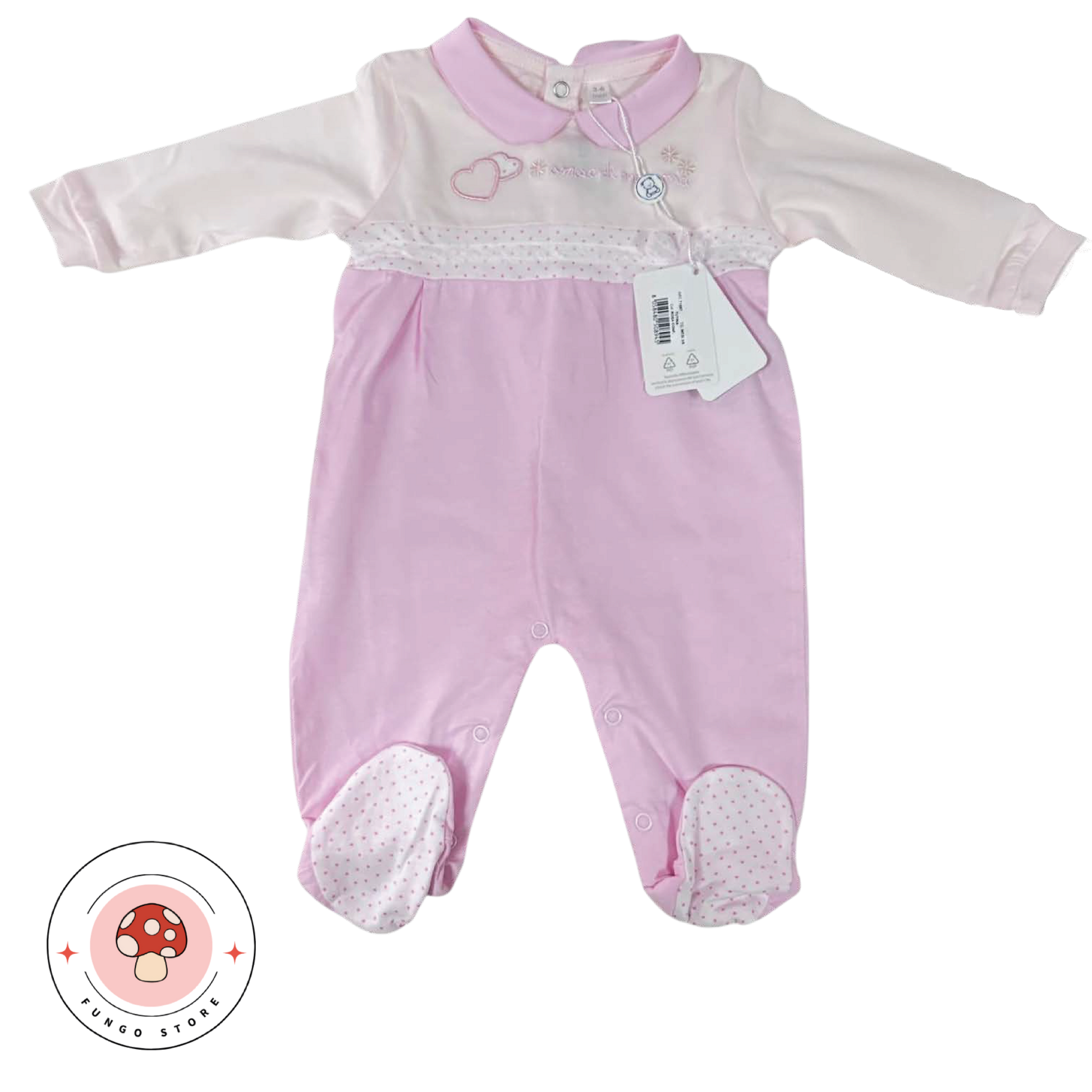 Dolcissima tutina intera in morbido cotone pensata per le piccolissime. Il design elegante è arricchito da un tenero colletto rosa e una fascia centrale decorata con mini pois e ricami floreali. I piedini sono chiusi e decorati con tessuto a pois, per proteggere dal freddo e mantenere uno stile impeccabile. Chiusura con bottoncini a pressione per cambi facili e veloci.